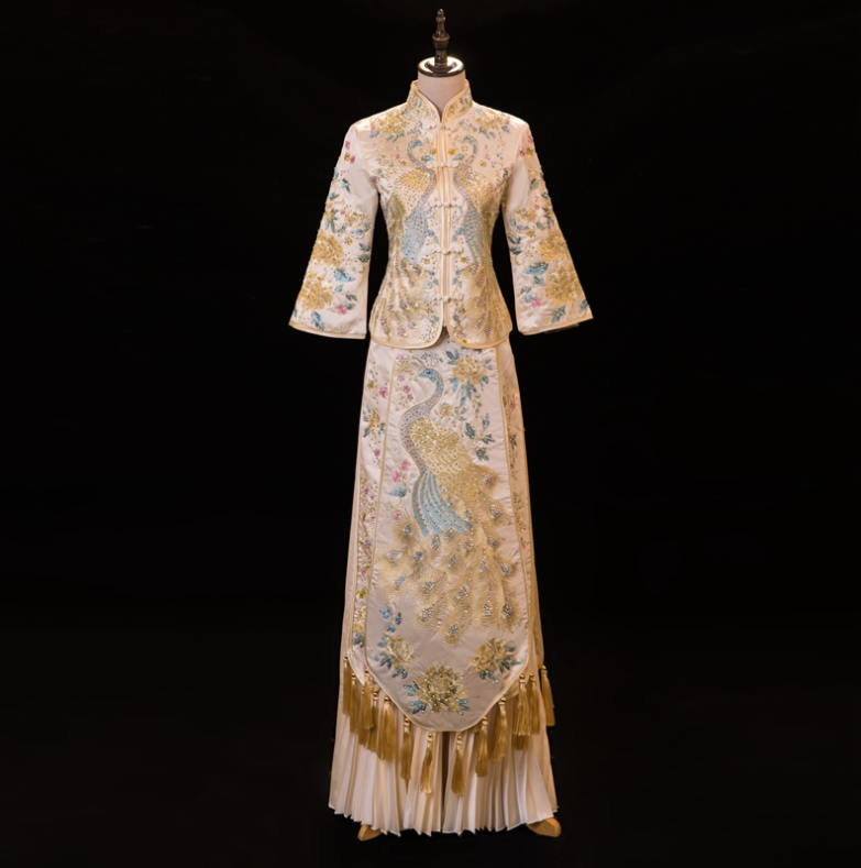 秀禾服新娘中式结婚嫁衣龙凤褂新款香槟色复古婚纱敬酒服出阁服 S 金色 中国汝州